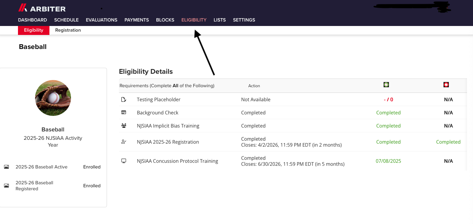 The NJSIAA Central Hub is located at http://njsiaahs.arbitersports.com. It is from this site that you will take the NFHS test, among other things. To take the test you must either visit this website and sign in using the upper right-hand corner or, when signed into the assignments portion of Arbiter, select the NJSIAA Office Central Hub. You then have the rights needed to take the test.